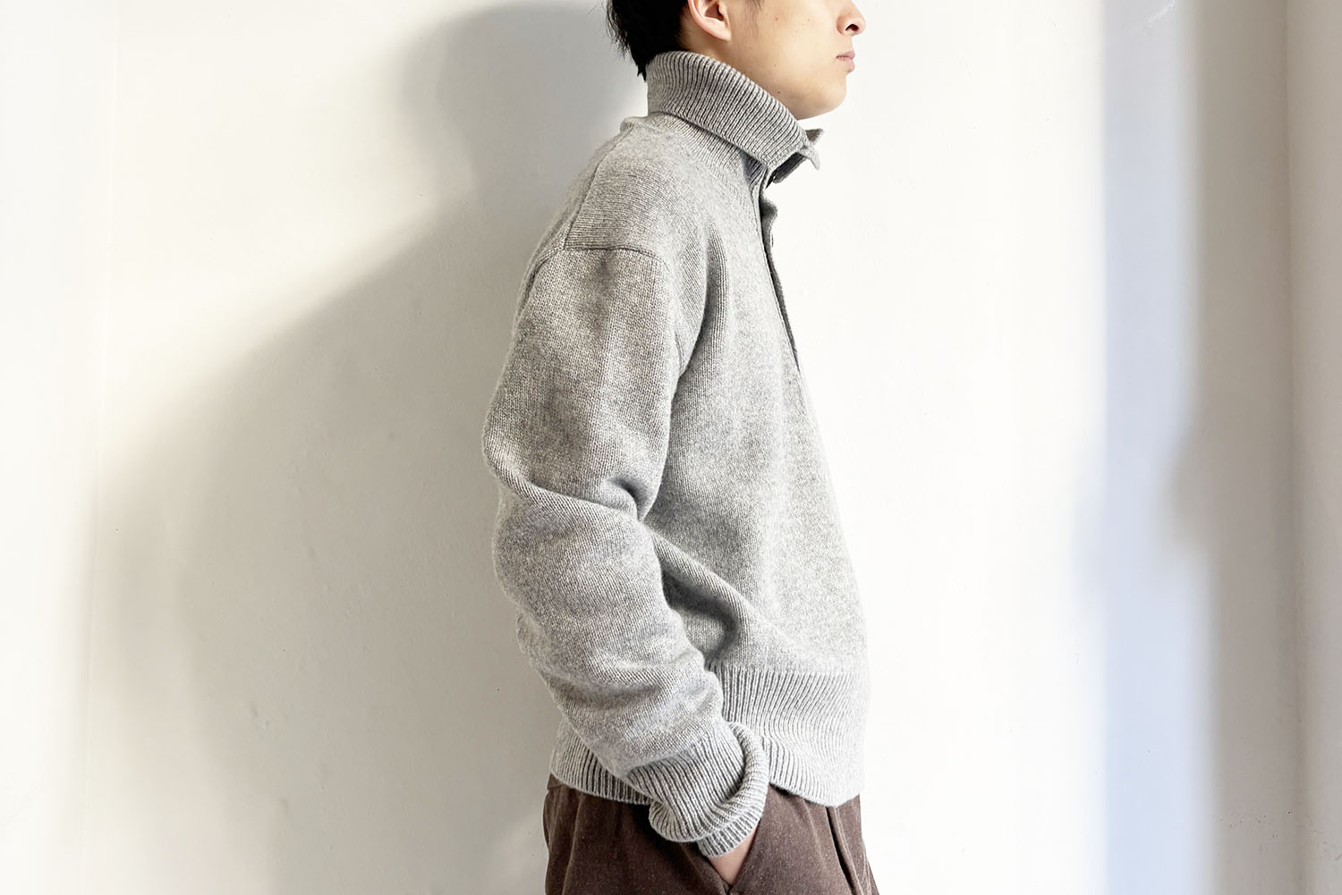 ウール・カシミア素材のハイネックニットは十分な肉厚を保持しながらも、ソフトな質感。
