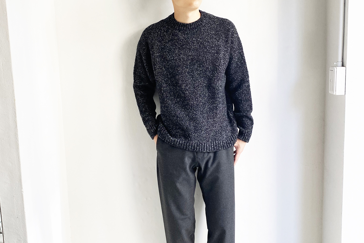 ざっくりとした編み目に細い糸色が不規則にあらわれ、表情豊かな編地です。