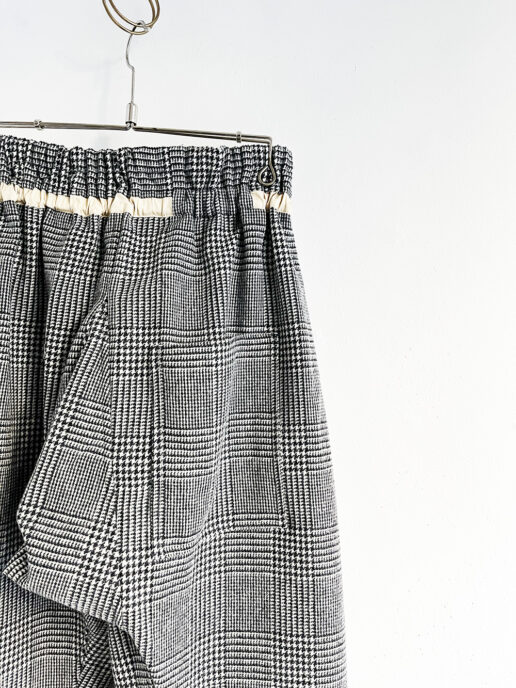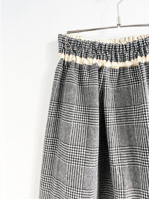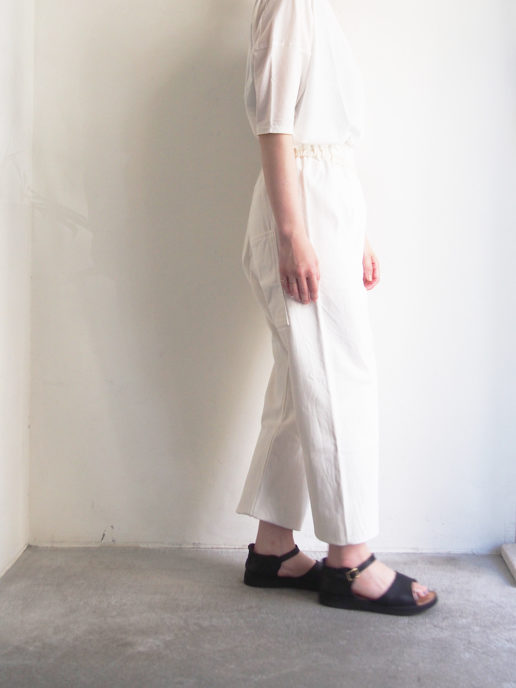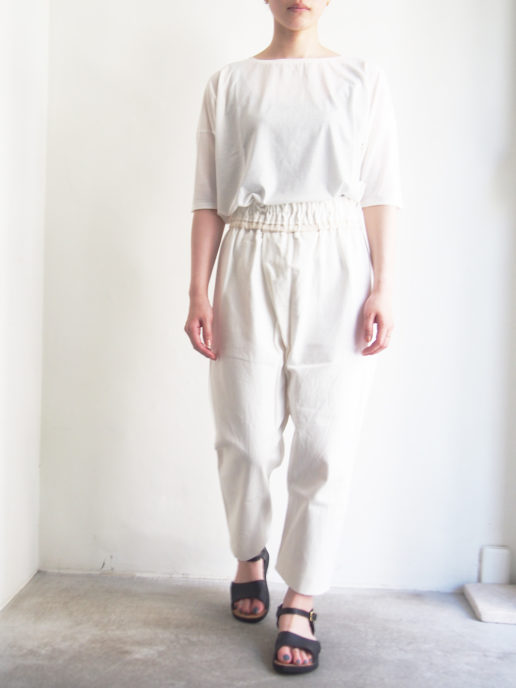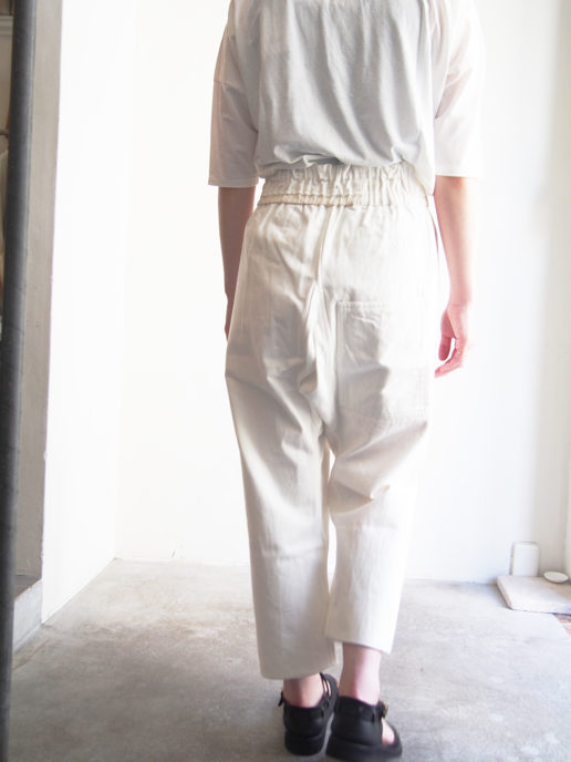 フロント部分の斜めに大きく取ったタックがポイントのヒップ周りにゆとりのあるサルエル風のシルエットです。