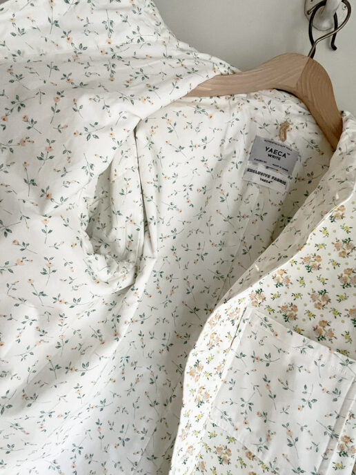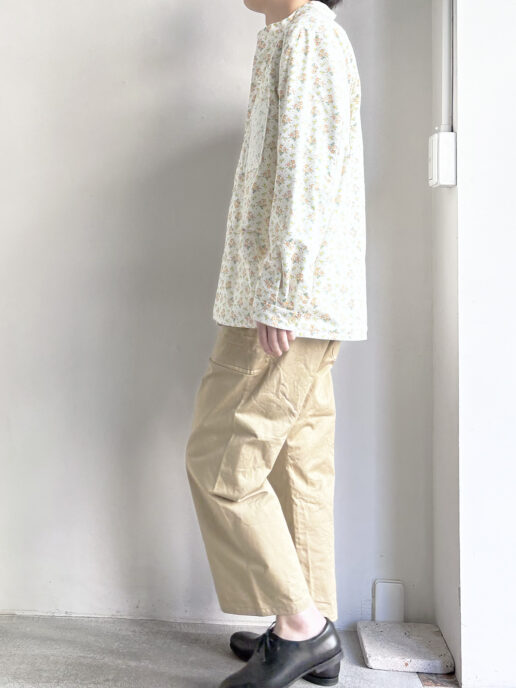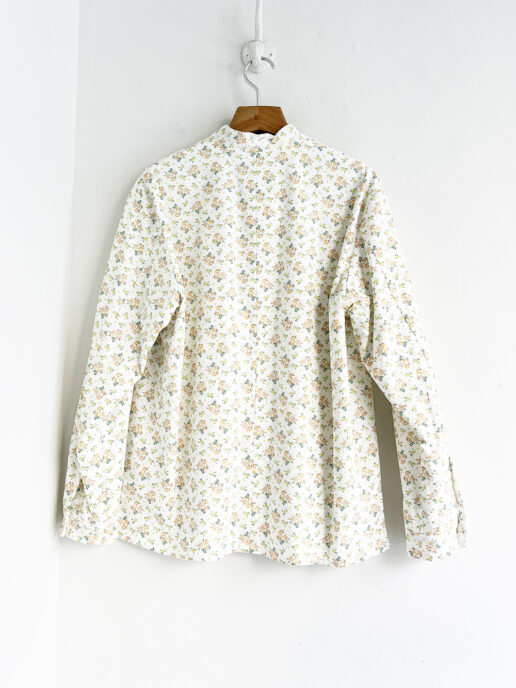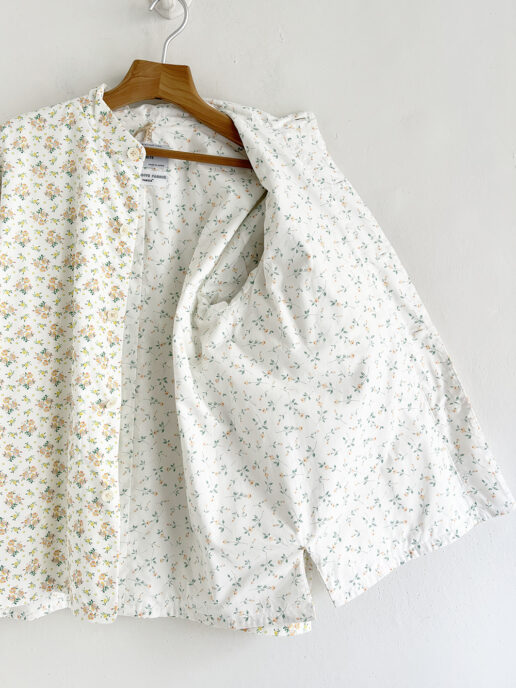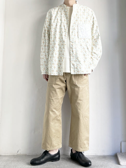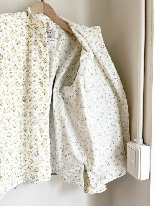 スタンドカラーに打ち合わせは5つボタン、左胸に裏地と同じ柄のポケットをあしらっています。