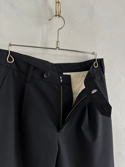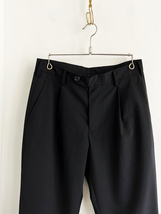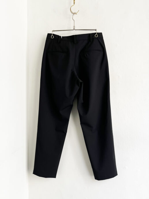 タックで腿のあたりにゆとりを持たせ、裾に向けて一気に削ったテーパードシルエットです。