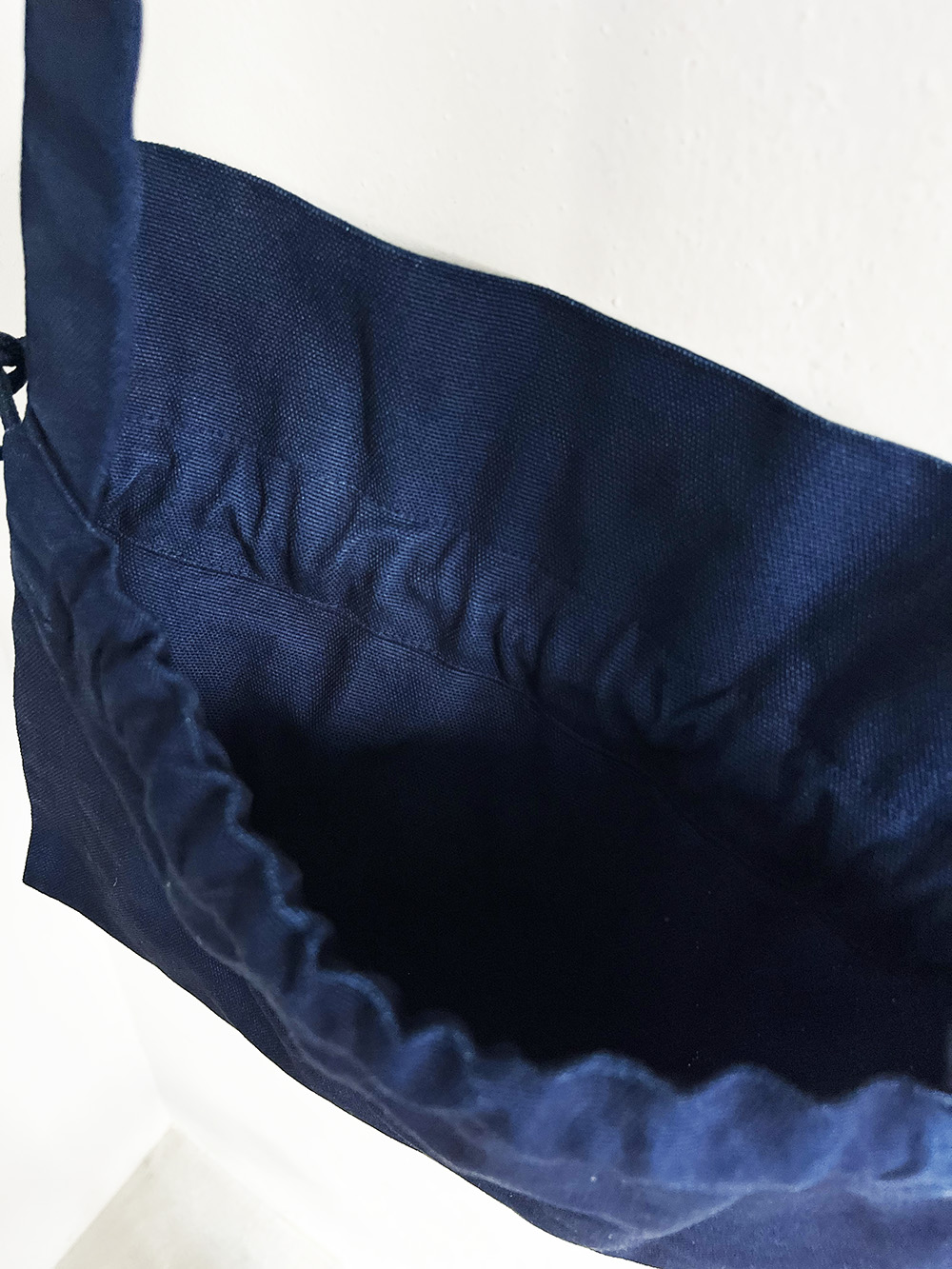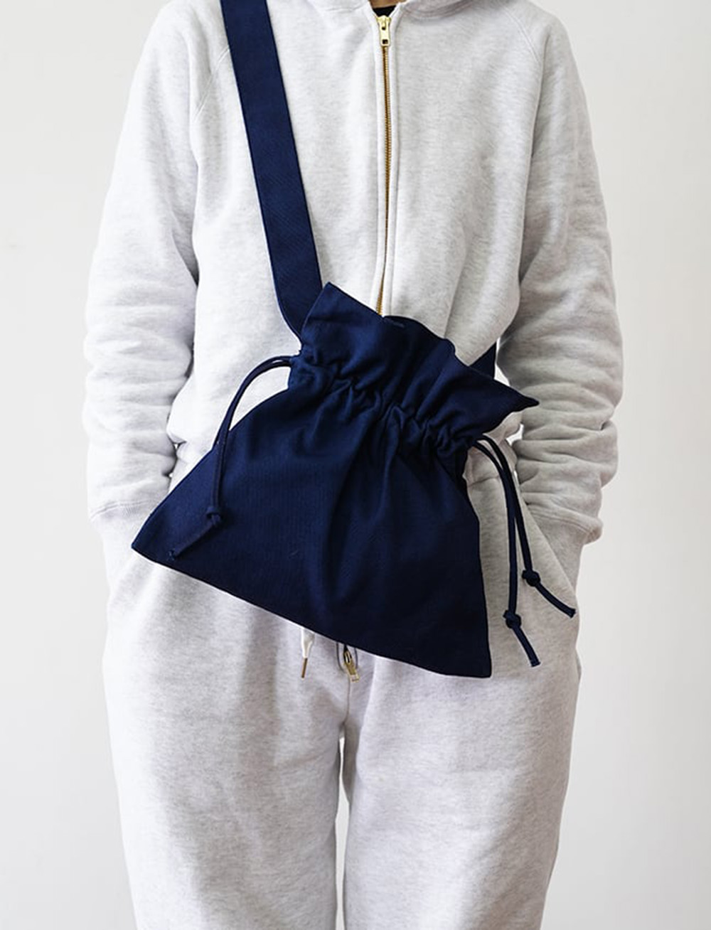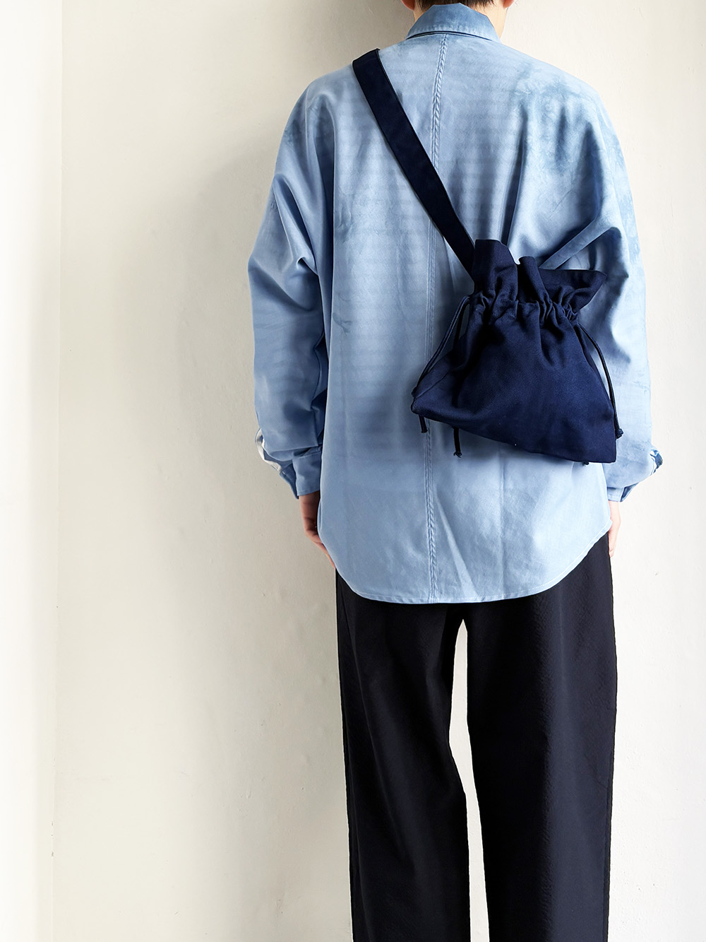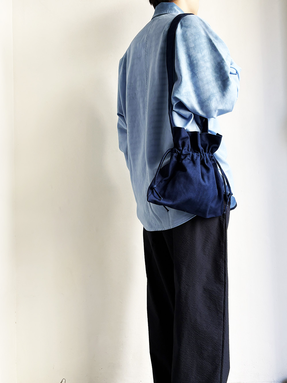 巾着のように絞って使う独自のデザインが引き立つショルダー。
