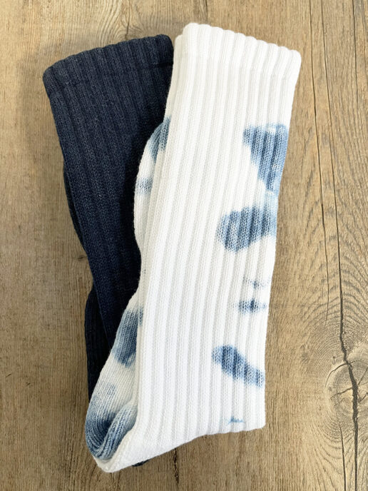 製品段階での絞り染めTIE-DYE を施した物をさらにネイビーに染め上げています。