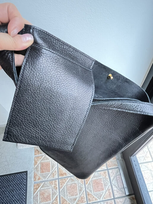 マチのないシンプルな作りですが、開口の広さと柔らかな素材でたっぷり入ります。