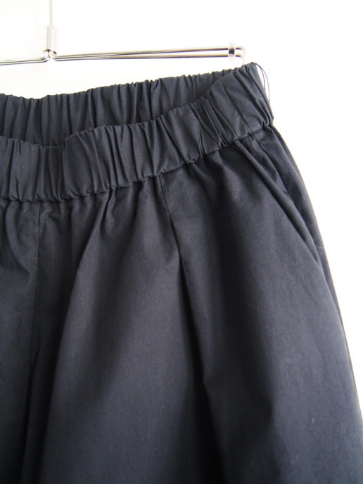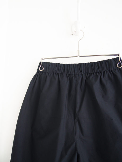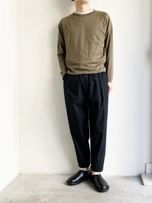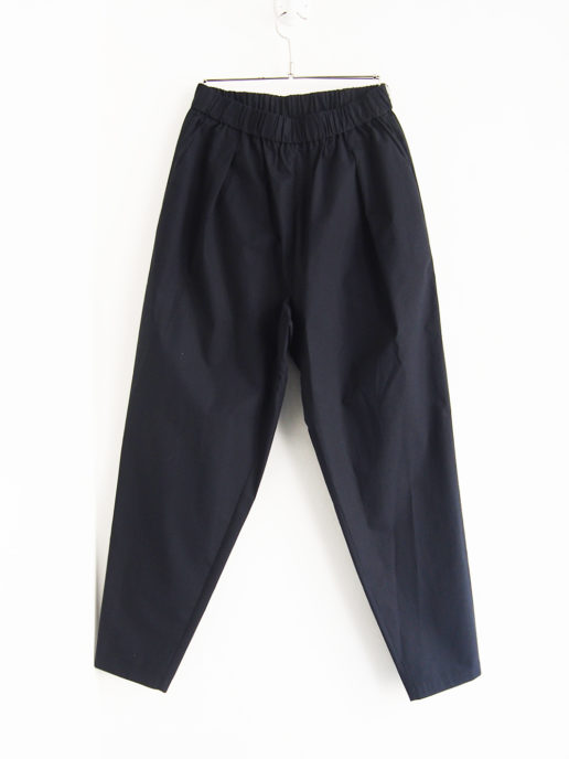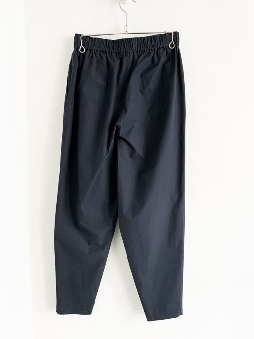 タックが入ったゆったりとしたイージーパンツは、ウエストがゴムになっており、少し丸みのあるシルエットです。