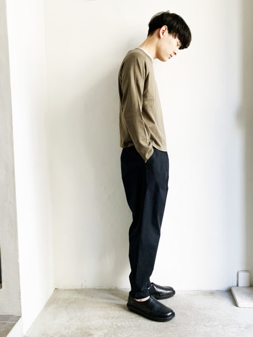 テーパードをしっかりかけるために裾幅を狭く取っています。