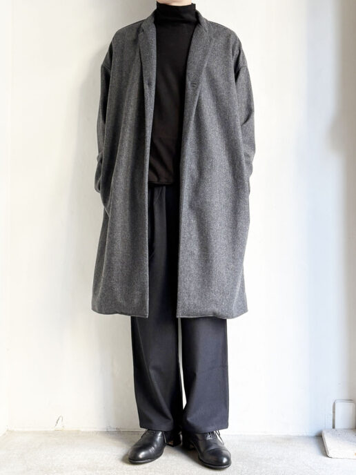 ネックの高さを前が長く後ろを短く設定することで、タートルネックとモックネックを調和させたような独特なネック周りに仕上がっています。