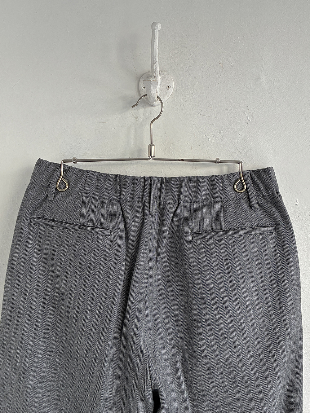 2タックなのでヒップとわたりにゆとりがあり、裾にかけて少しテーパードのセミワイドなシルエット。
