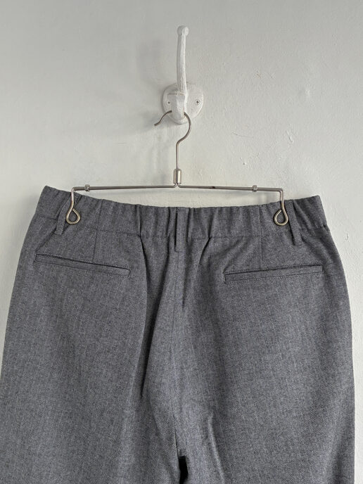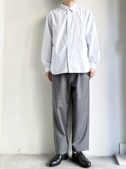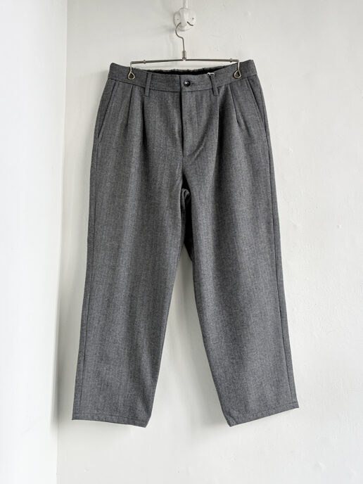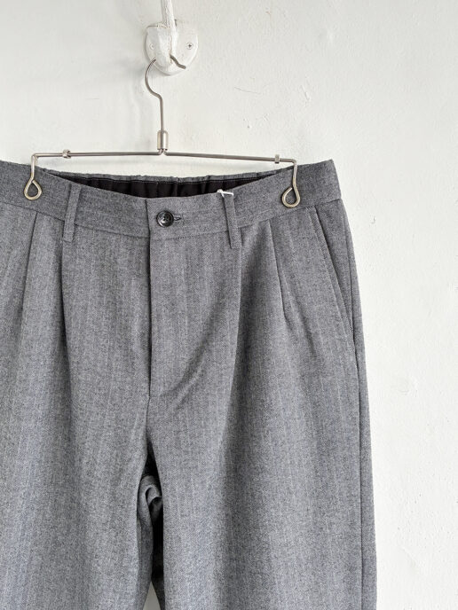 2タックなのでヒップとわたりにゆとりがあり、裾にかけて少しテーパードのセミワイドなシルエット。