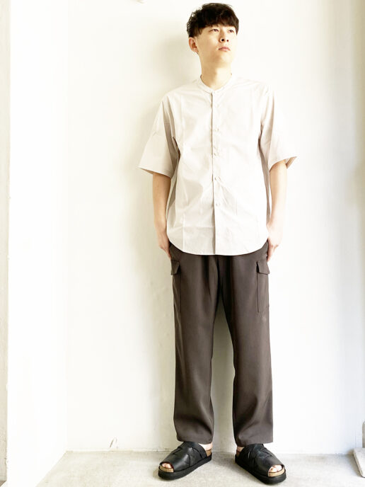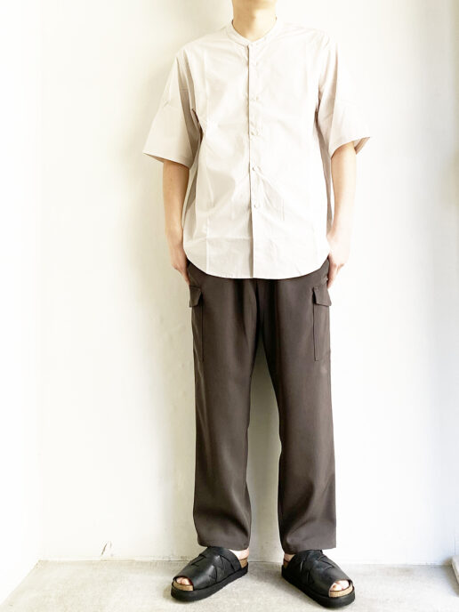 リラックスシルエットでシンプルなデザインのバンドカラーのシャツ。