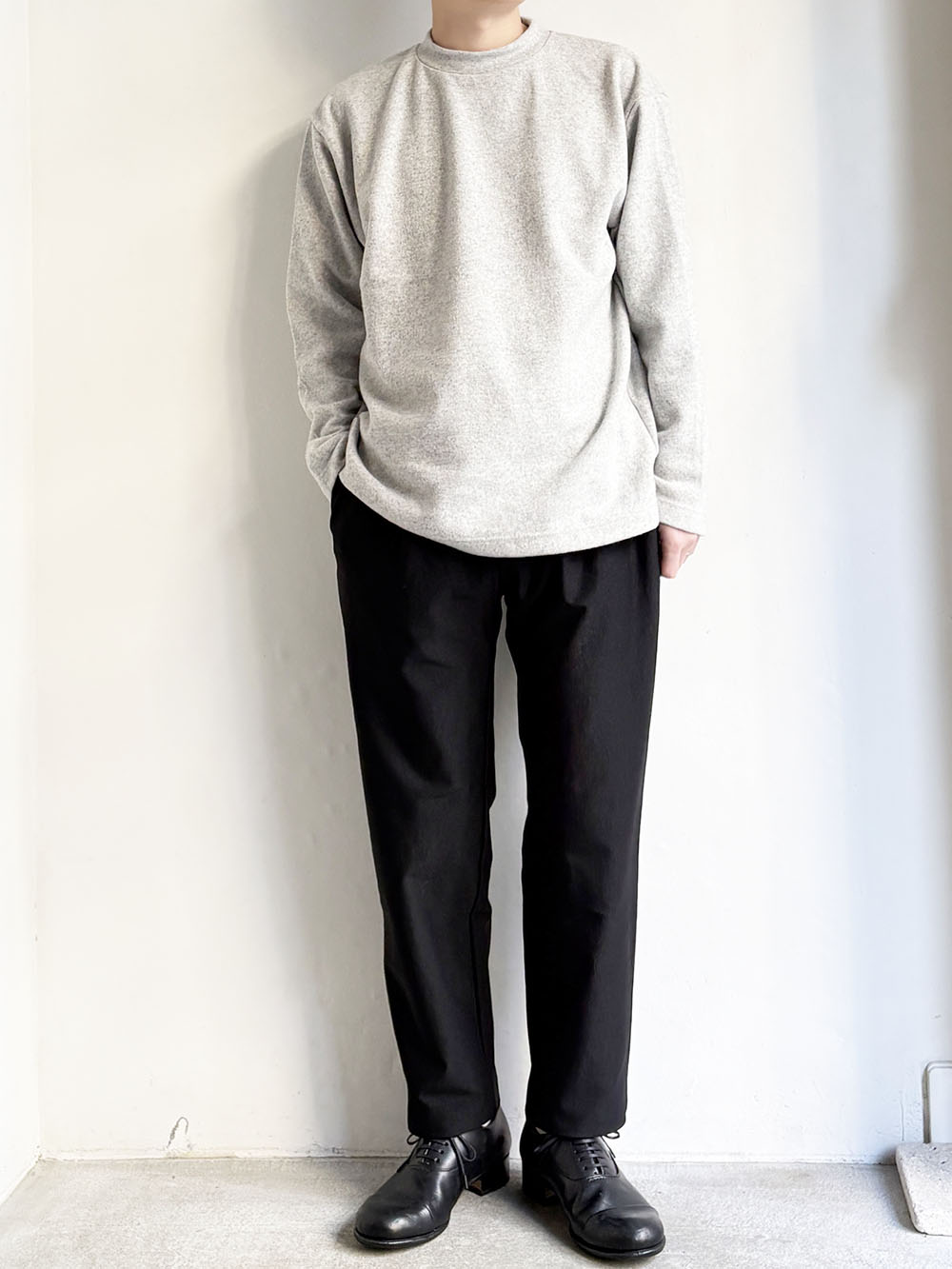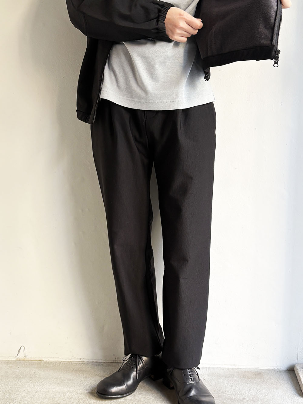 同じ素材にて二つのシルエットの展開、こちらははゆったりとしたワイドシルエットです。