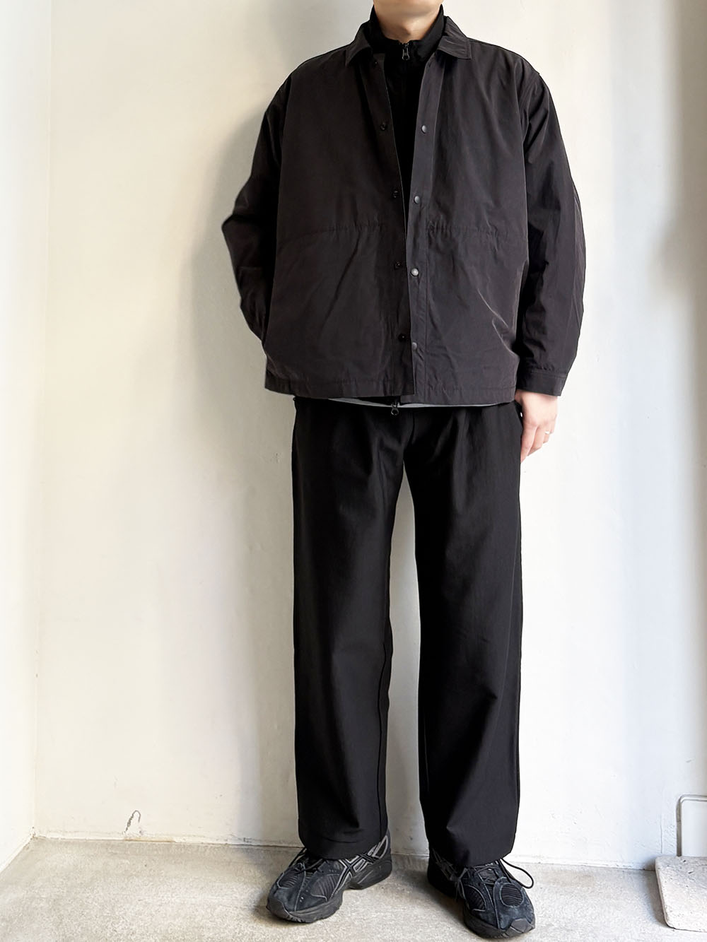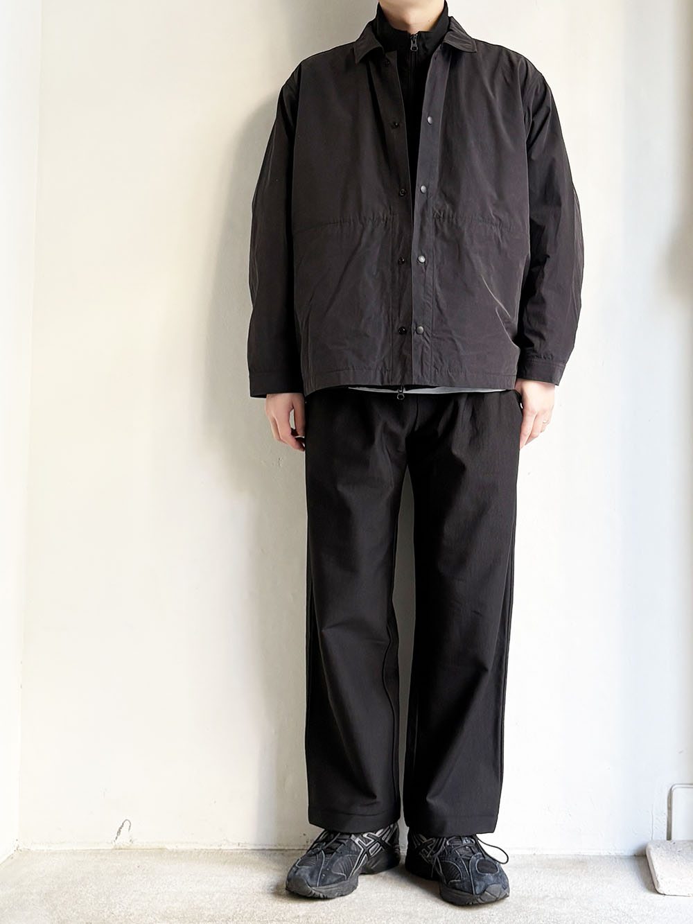 同じ素材にて二つのシルエットの展開、こちらははゆったりとしたワイドシルエットです。