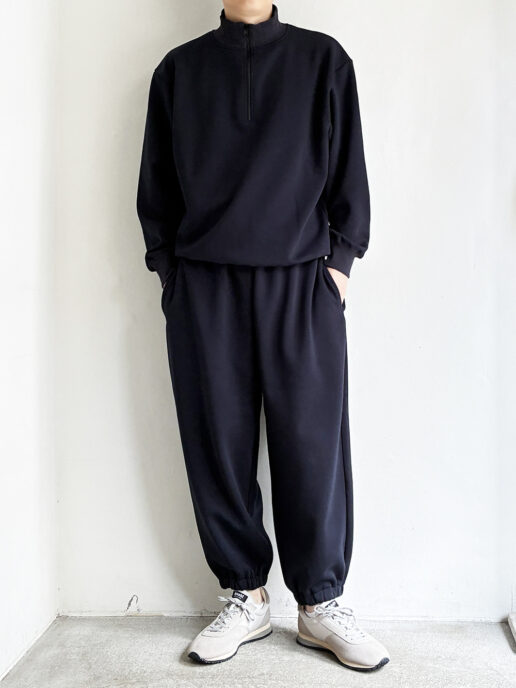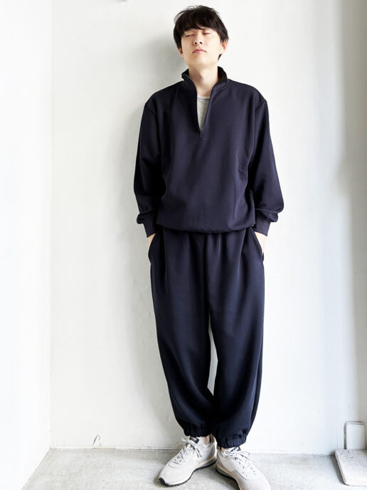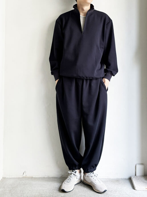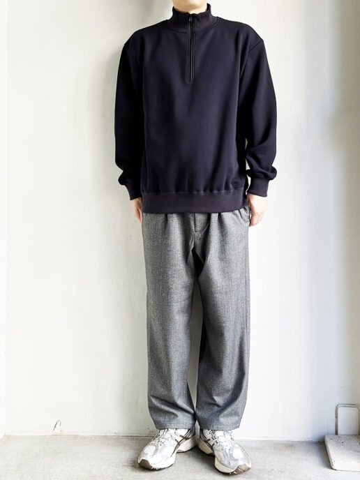 ゆったりとしたサイズ感で、着用することができるハーフジップハイネックプルオーバーです。