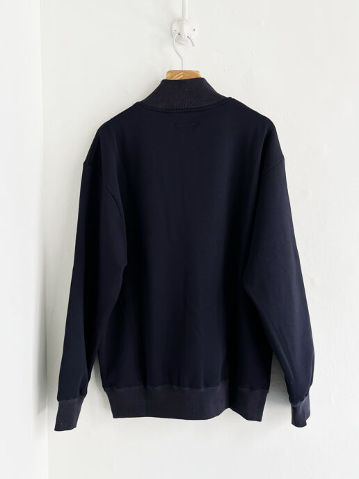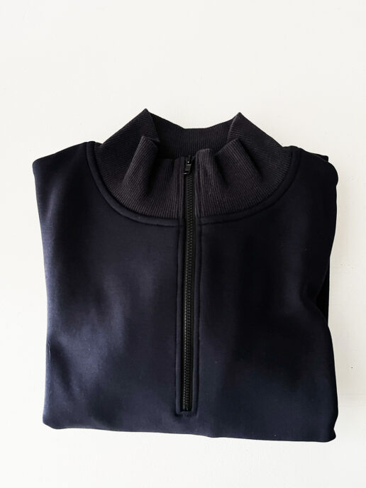ヴィスロンファスナーを使用したハーフジップ、リブのハイネックがポイント。
