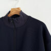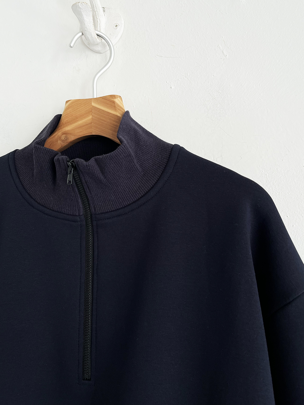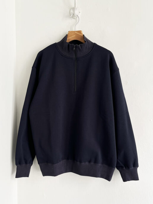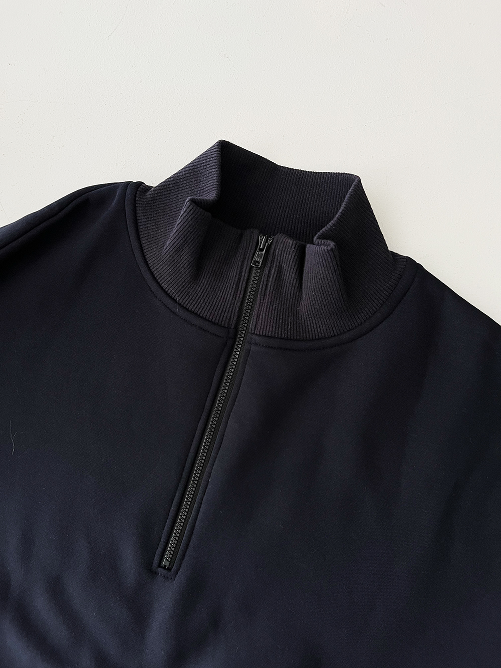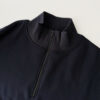 ヴィスロンファスナーを使用したハーフジップ、リブのハイネックがポイント。