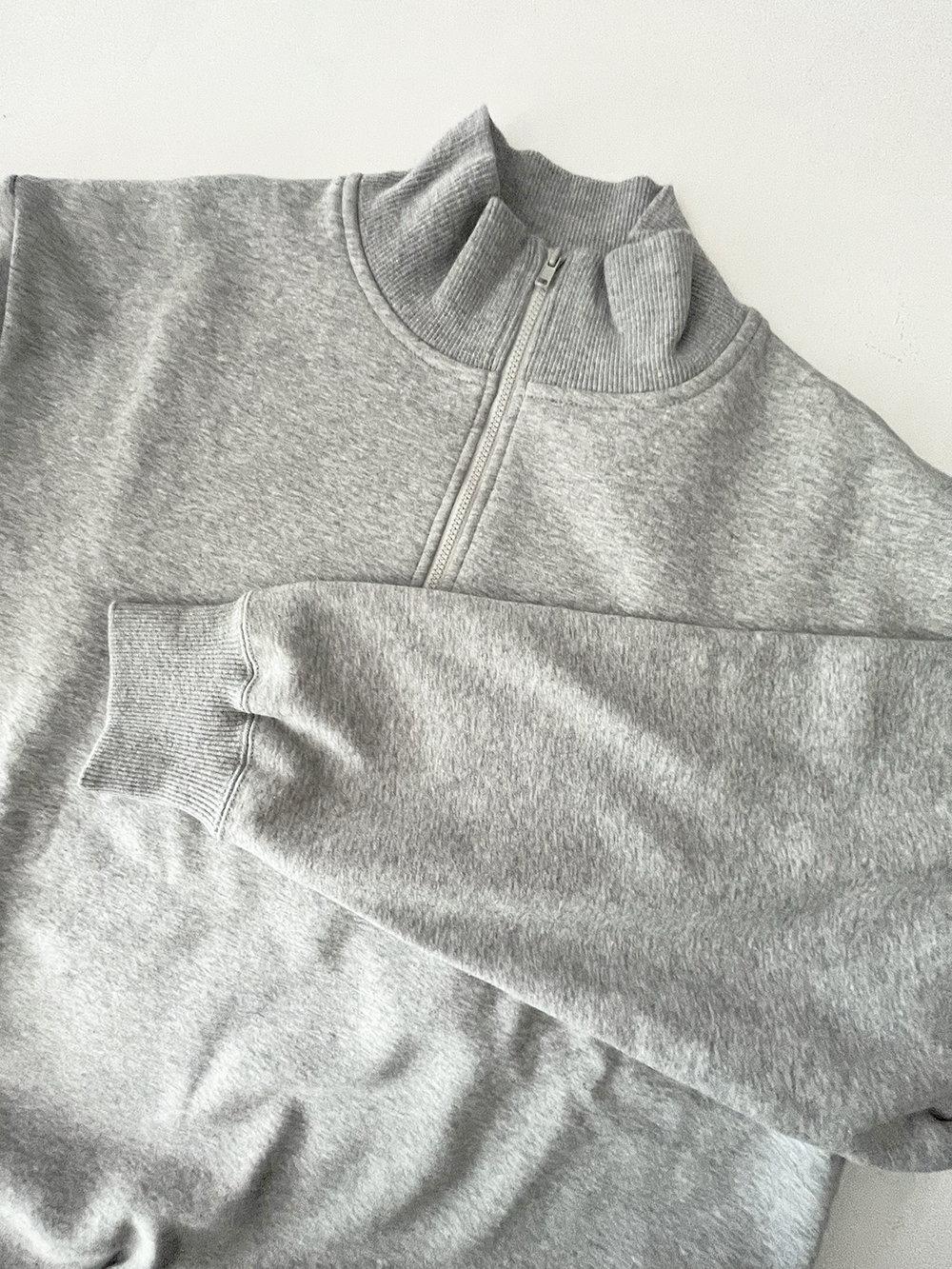 ヴィスロンファスナーを使用したハーフジップ、リブのハイネックがポイント。