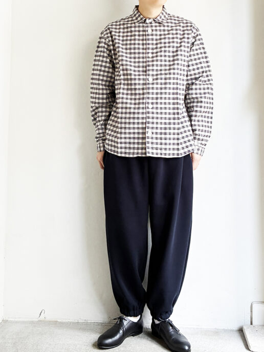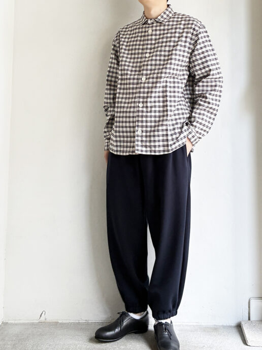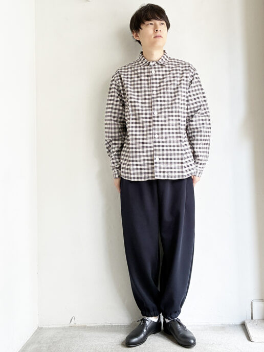 ウエストはゴムとひもの通った楽な穿き心地。イージーパンツですがシャツとの相性もいいですよ。