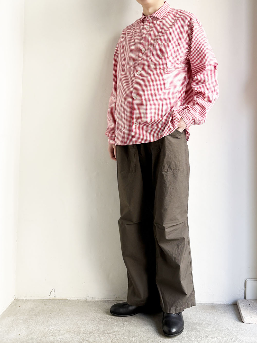 シルエットは、肩が少し落ちて身幅はゆったりしたサイズ感です。