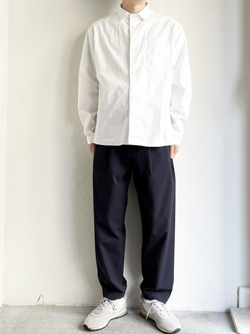 シルエットは、肩が少し落ちて身幅はゆったりしたサイズ感です。