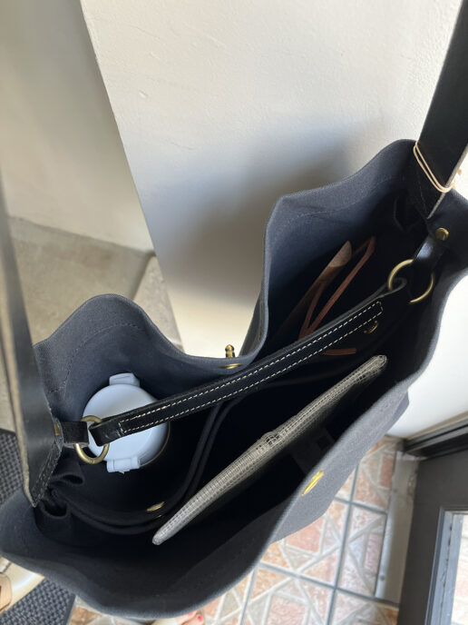 バッグの中にはハンドバッグとしても使えるレザーハンドルもついており、2WAYで使う事もできます。