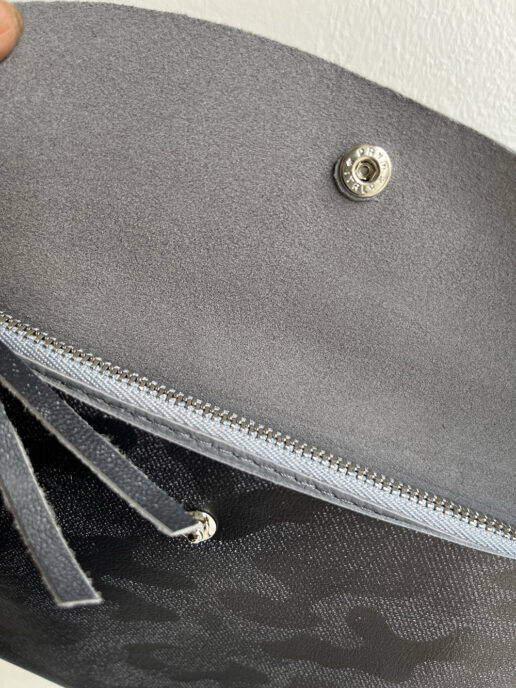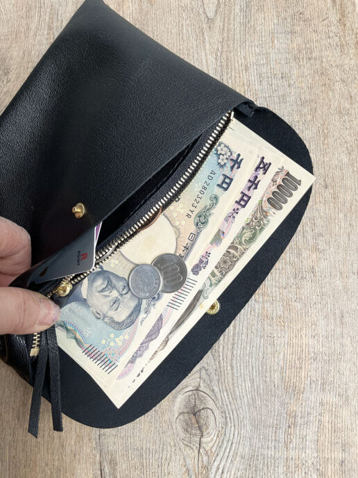 マチが無くすっきりしたデザインで、上品なシルバーのスナップボタンとファスナーがアクセントになります。