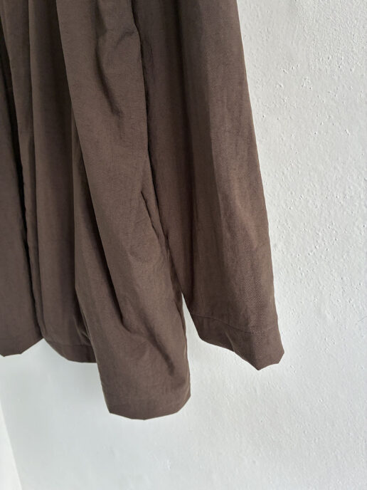 ボタンは一つだけの和の服、直線で切り取ったパーツを縫い合わせた平面構成を意識した商品になります。