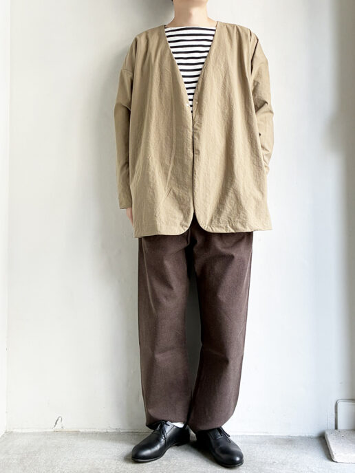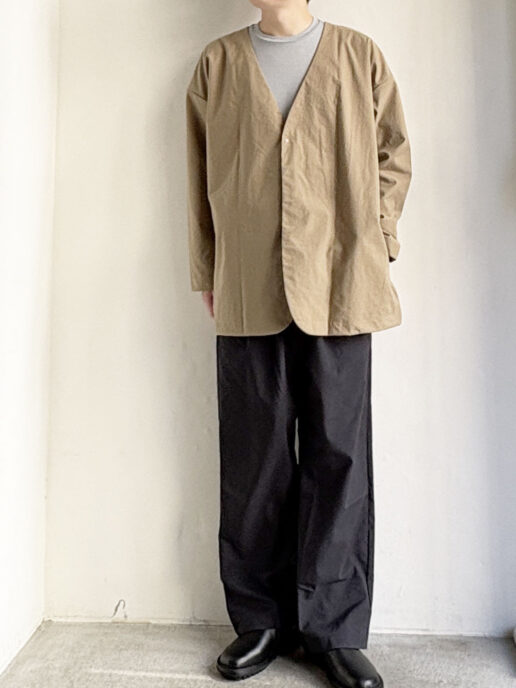 最低限の必要なステッチのみで縫製しており、1枚の生地を羽織ったような仕上がりにしています。