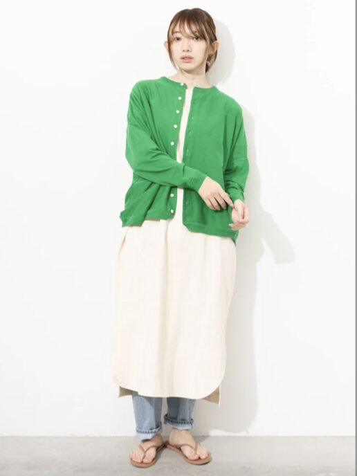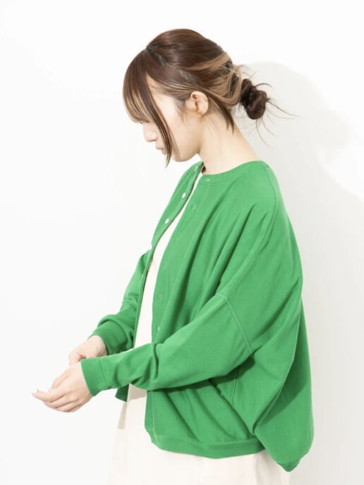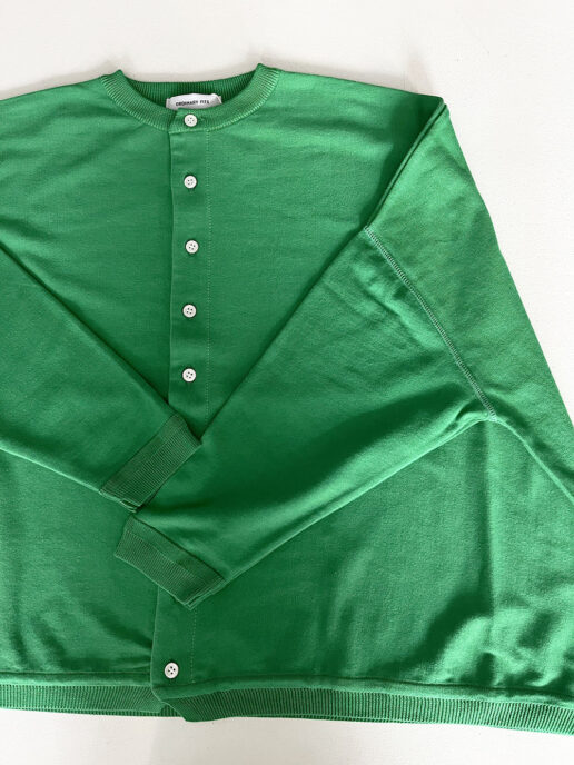 クルーネックは止めて一枚でも開けても使える使いやすいアイテム。