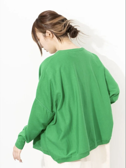 肩の落ちたドロップショルダーで身幅にゆとりを持たせたワイドシルエット。