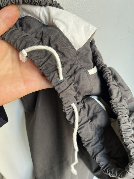 ウエストはゴム、紐付きでジップフライ、股上は深め。