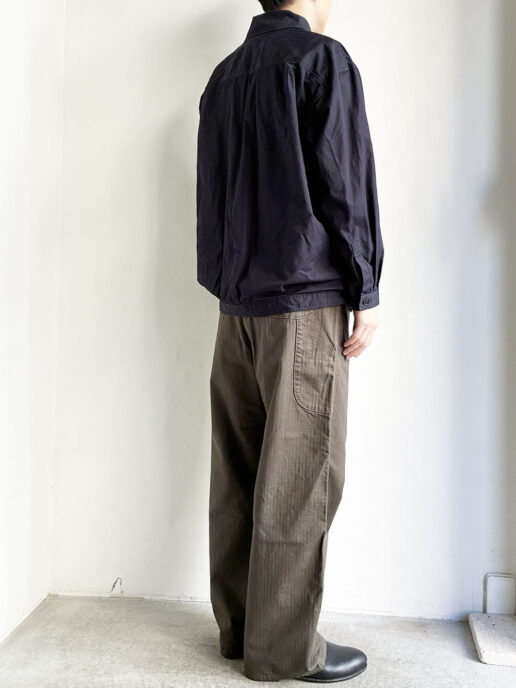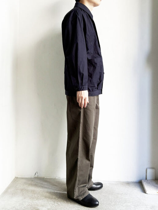 従来のフレンチワークパンツと比べ、やや厚めのコットンヘリンボーンツイル生地を採用。