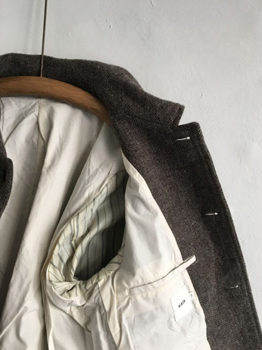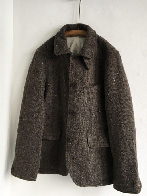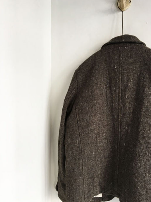 6番単糸の上質なウールツィード糸をヘリンボーン柄の綾織にしてつくられたシンプルなカバーオールです。