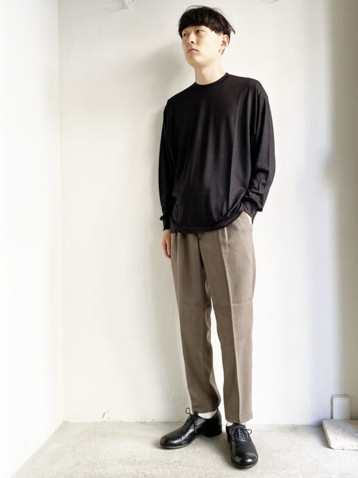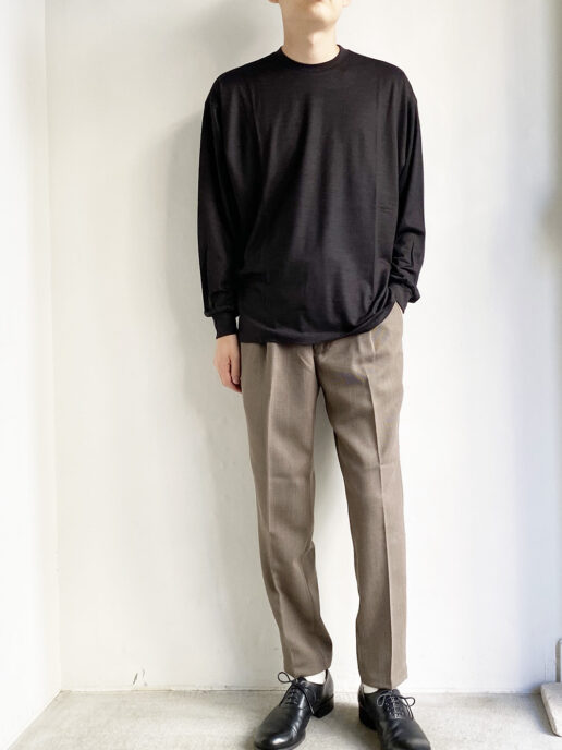 リラックスしたシルエットですがネック周りは程よく引き締めています。