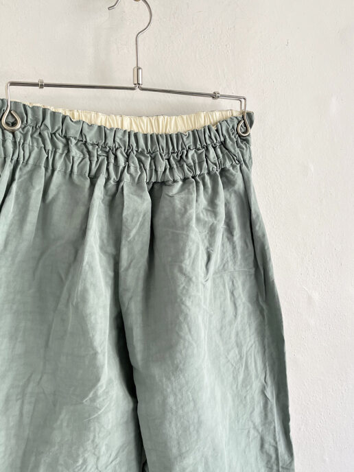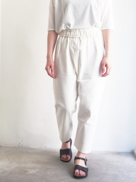 フロント部分の斜めに大きく取ったタックがポイントのヒップ周りにゆとりのあるサルエル風のシルエットです。