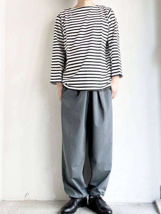 元々は漁師や船乗りのワークウェアとして生まれたバスクシャツは、着脱しやすいよう襟ぐりが広いボートネック仕様になります。