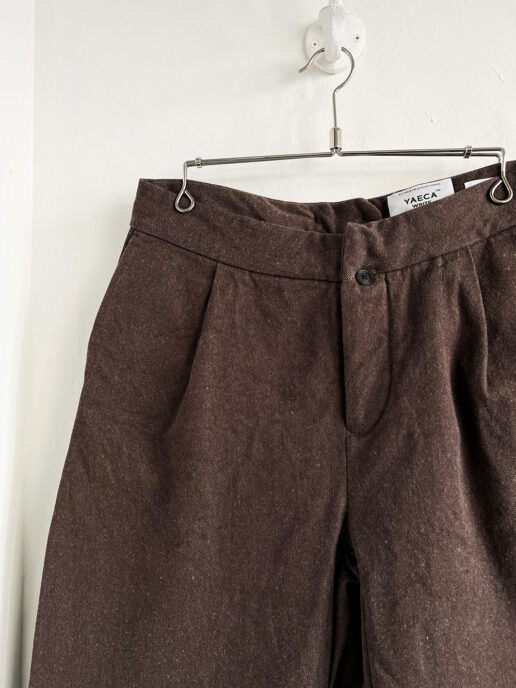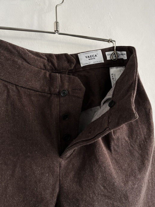 オークのボタニカルダイで染めたタテ糸をヨコ糸は生成のオリジナルのブラウンデニムです。