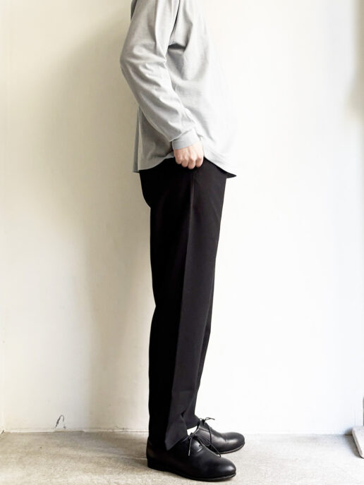 緩やかなテーパードシルエットで、足元はすっきりした上品なシルエット。